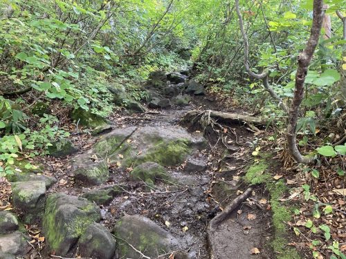 石だらけの山道を50分ほど歩いた